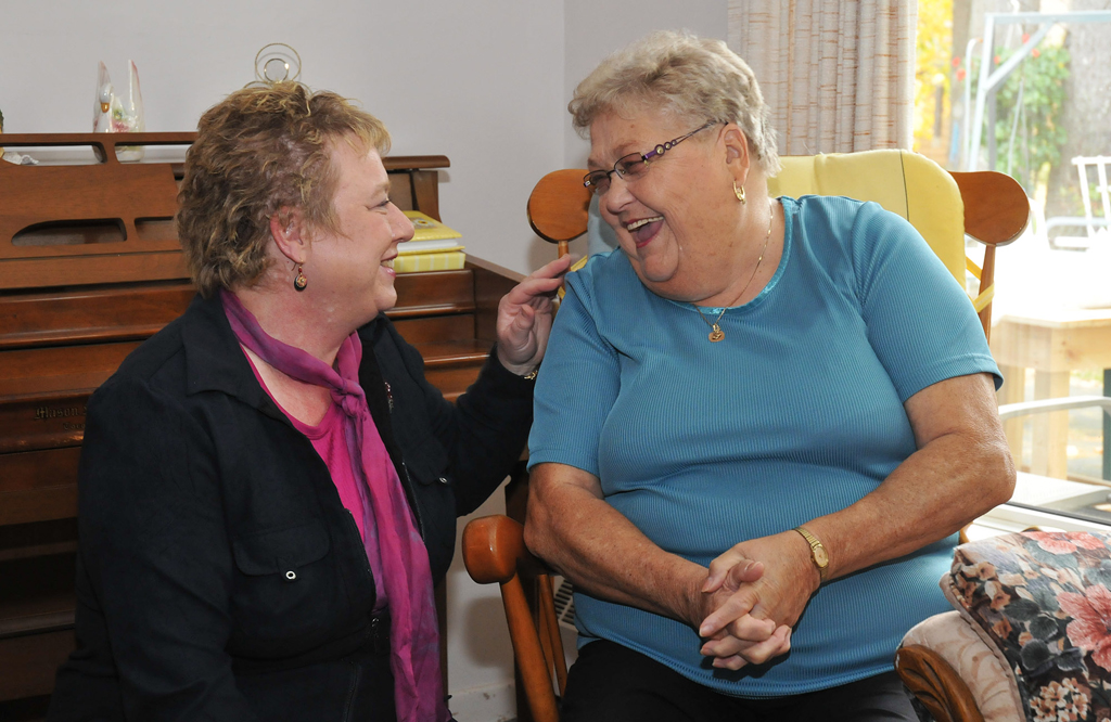Community Services Minister Denise Peterson-Rafuse shares a laugh with Florence Acker, a resident of Miller Manor.