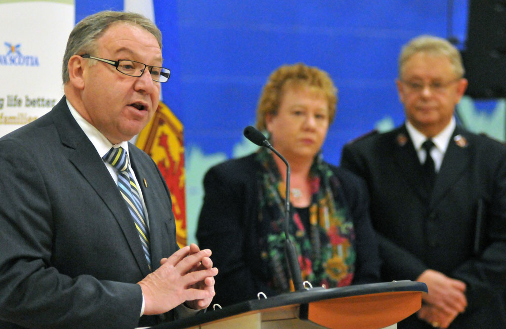 Premier Darrell Dexter talks about the province's more than $18-million investment to help low-income families as Community Services Minister Denise Peterson-Rafuse and Major Larry Martin, divisional commander, Maritime division, The Salvation Army look on.