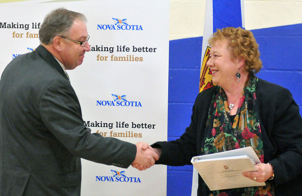 Premier Darrell Dexter shakes Community Services Minister Denise Peterson-Rafuse's hand as she steps to the podium to talk about new help for low-income families.