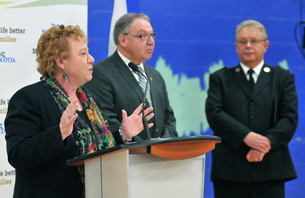 Community Services Minister Denise Peterson-Rafuse talks about the province's largest investment in more than a decade to help low-income families as Premier Darrell Dexter and Major Larry Martin, divisional commander, Maritime division, The Salvation Army look on.