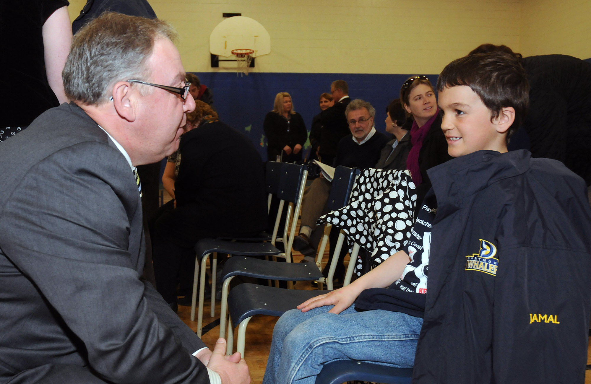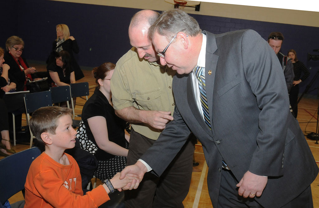 Jason LeBlanc shakes Premier Darrell Dexter's hand after an announcement of more than $18-million investment to help low-income families.