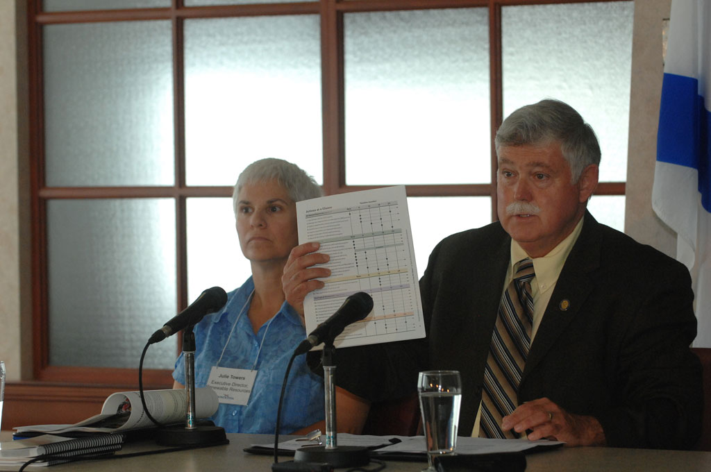 Natural Resources Minister Charlie Parker holds up part of the strategy as Julie Towers, executive director of renewable resources looks on during a news conference.