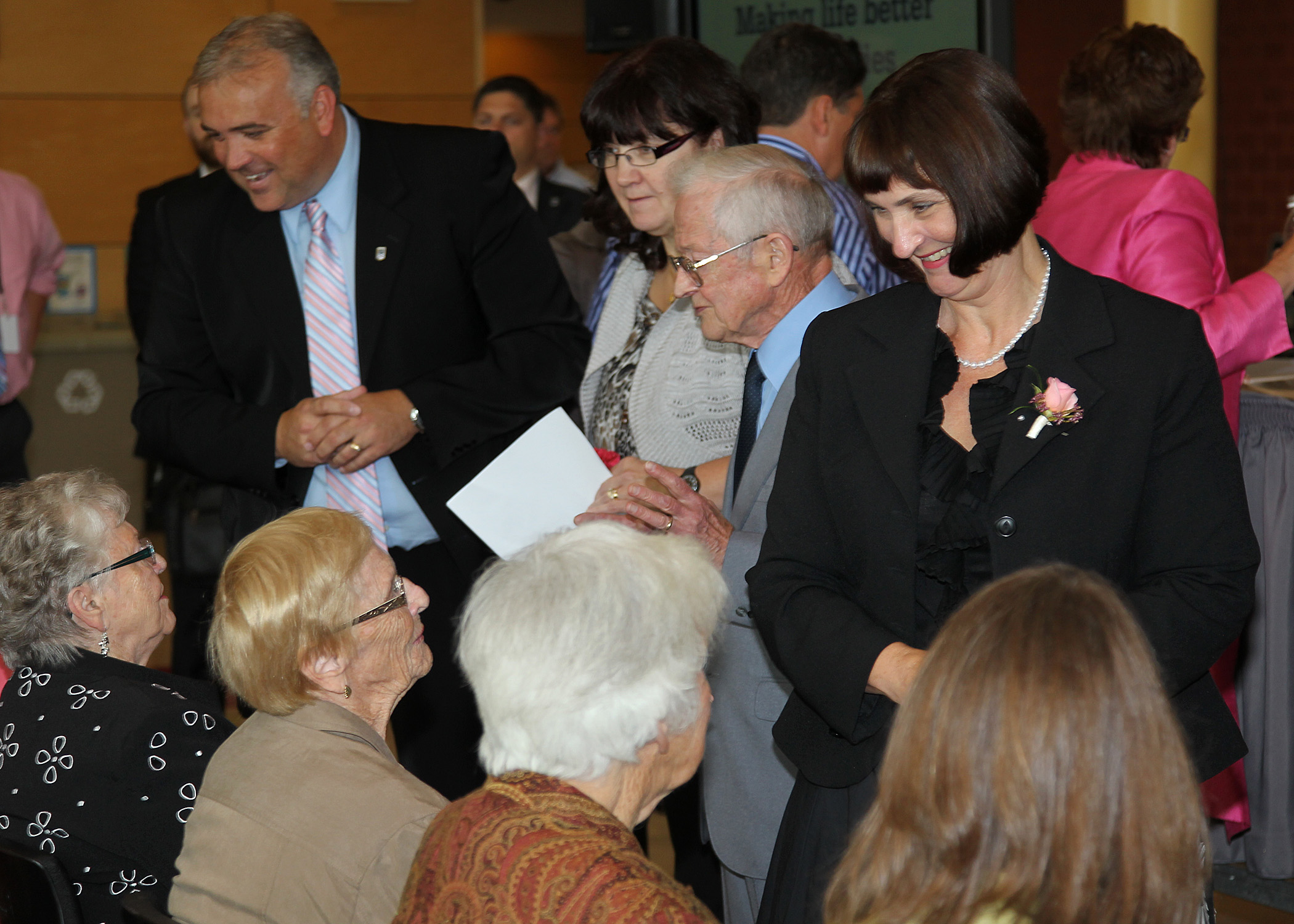 Communities, Culture and Heritage Minister David Wilson (left) and Education Minister Ramona Jennex (right) talk with some Queen Elizabeth High School alumni.