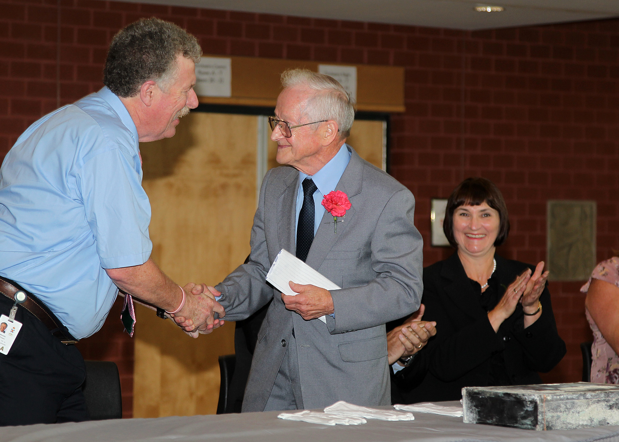 Transportation and Infrastructure Renewal Minister Bill Estabrooks shakes hands with Queen Elizabeth High School alum Wallace Matthews as Education Minister Ramona Jennex applauds.
