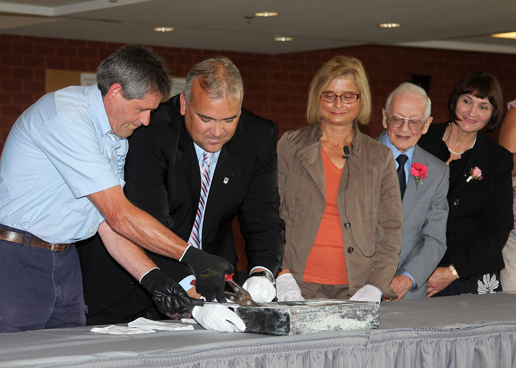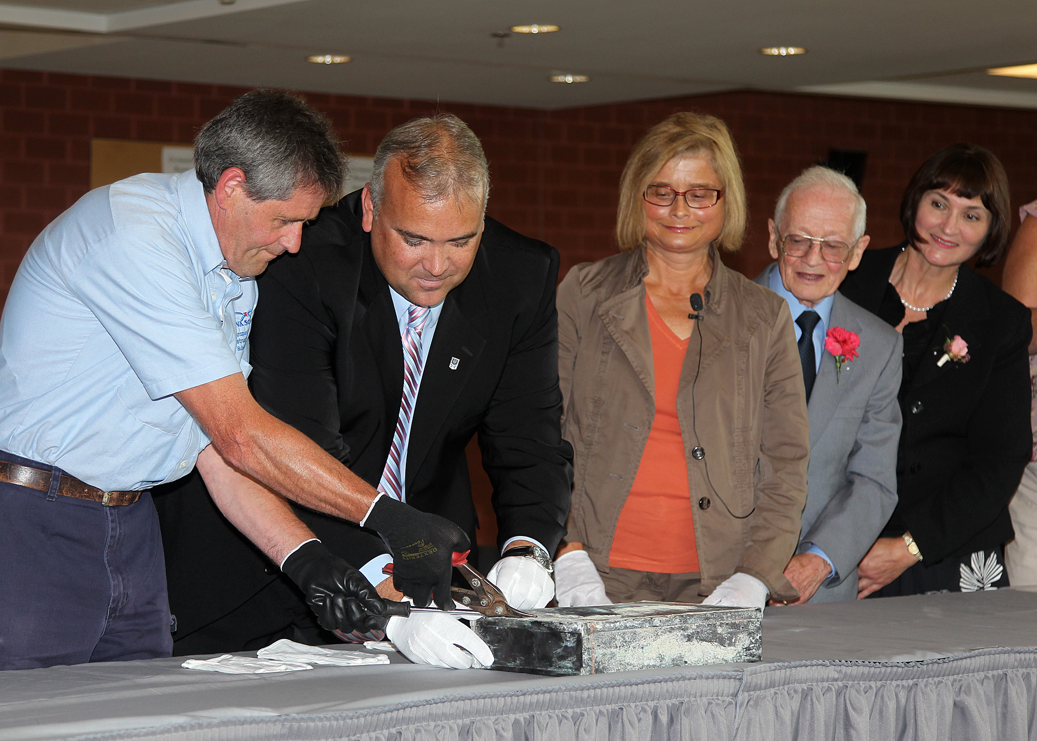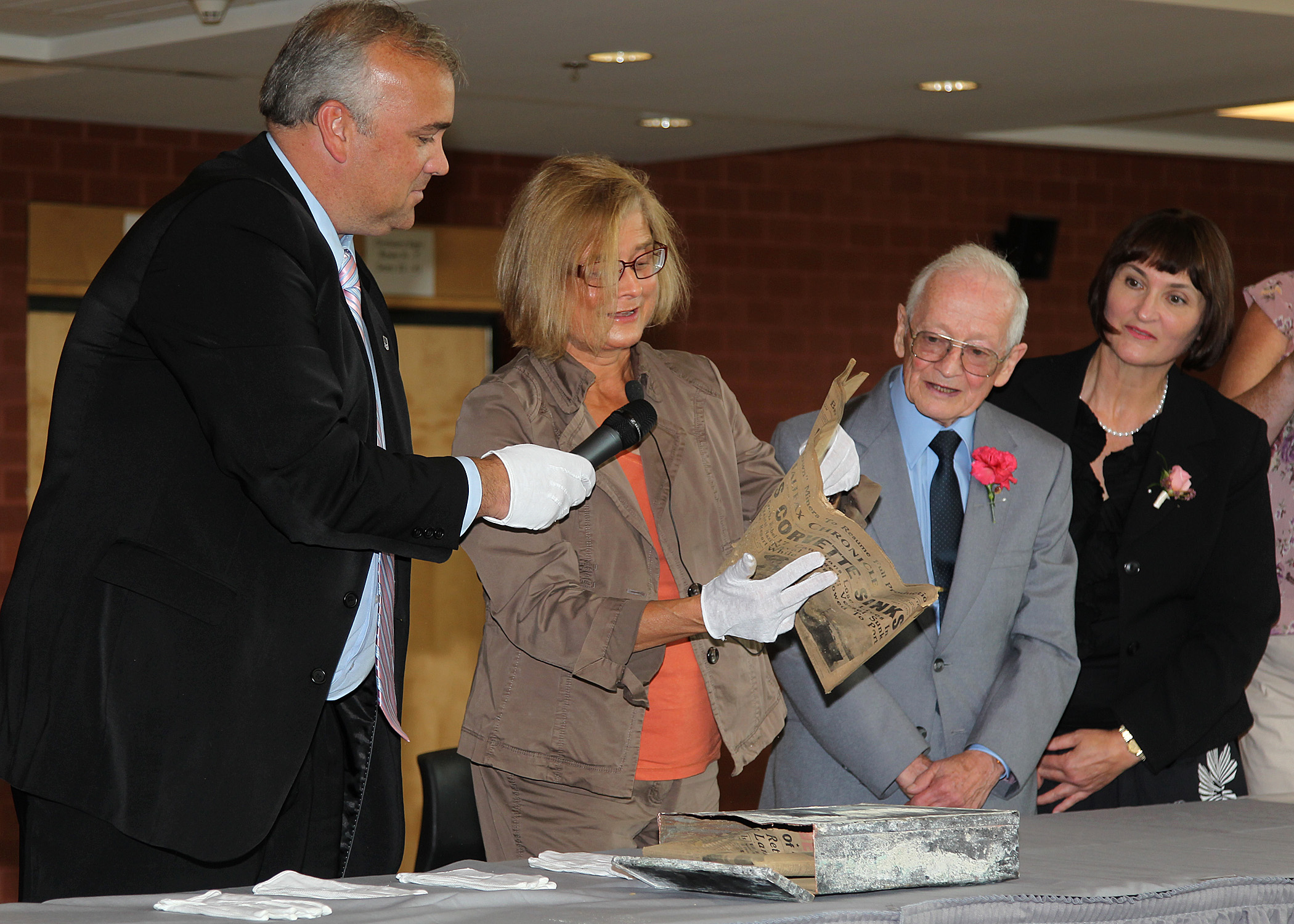 Communities, Culture and Heritage Minister David Wilson holds the time capsule copper box as it is cut open and the head table guests look on.