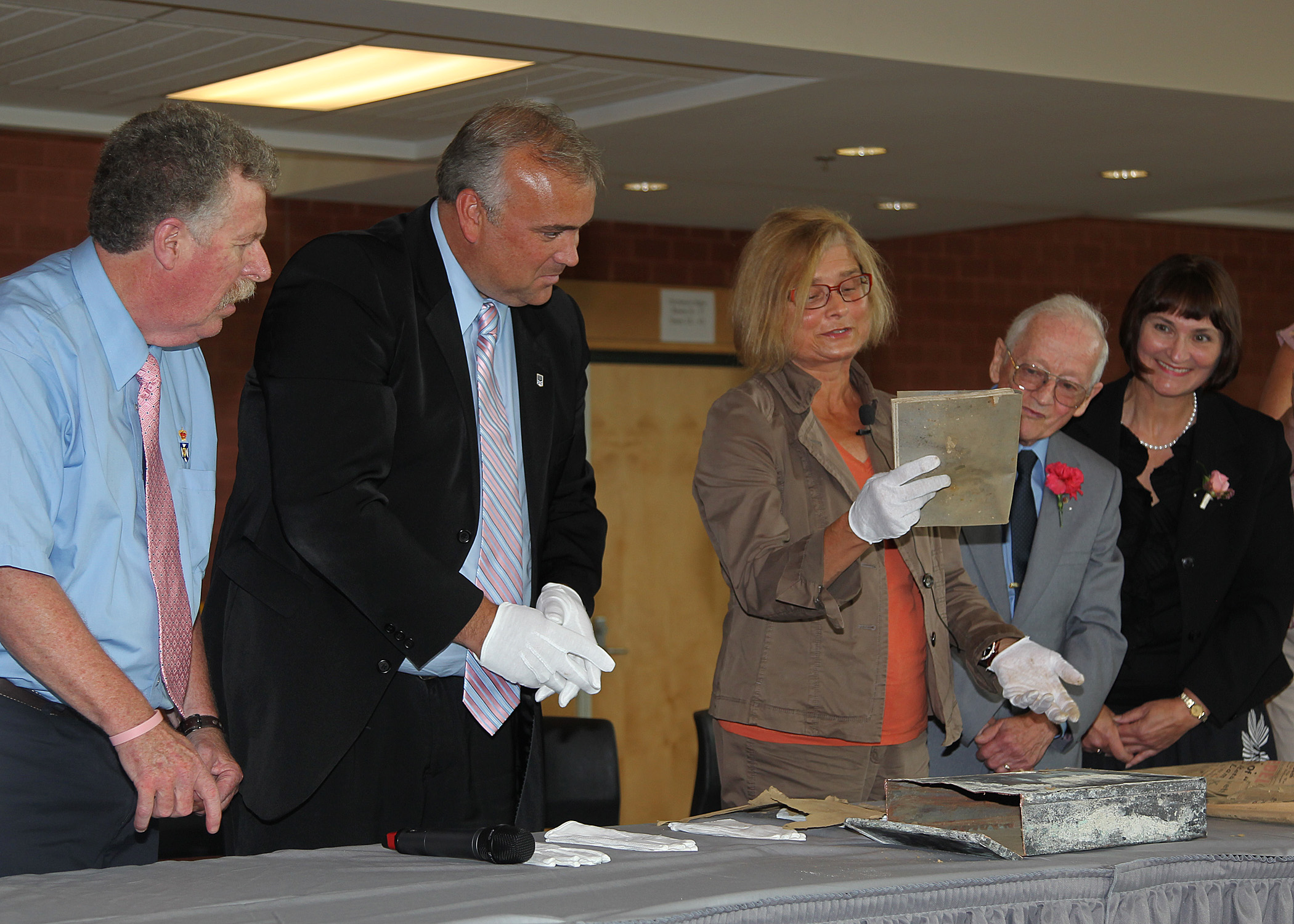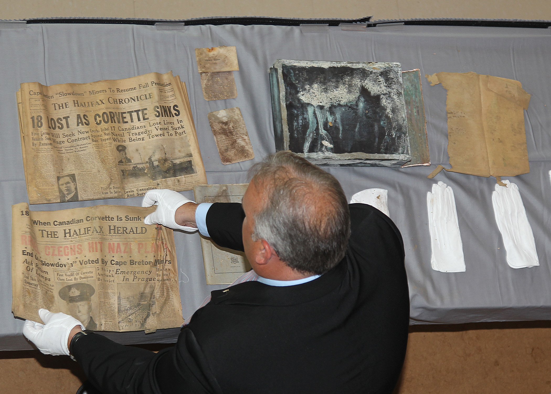 Communities, Culture and Heritage Minister David Wilson spreads out the contents of the time capsule placed during the construction of Queen Elizabeth High School in 1941.