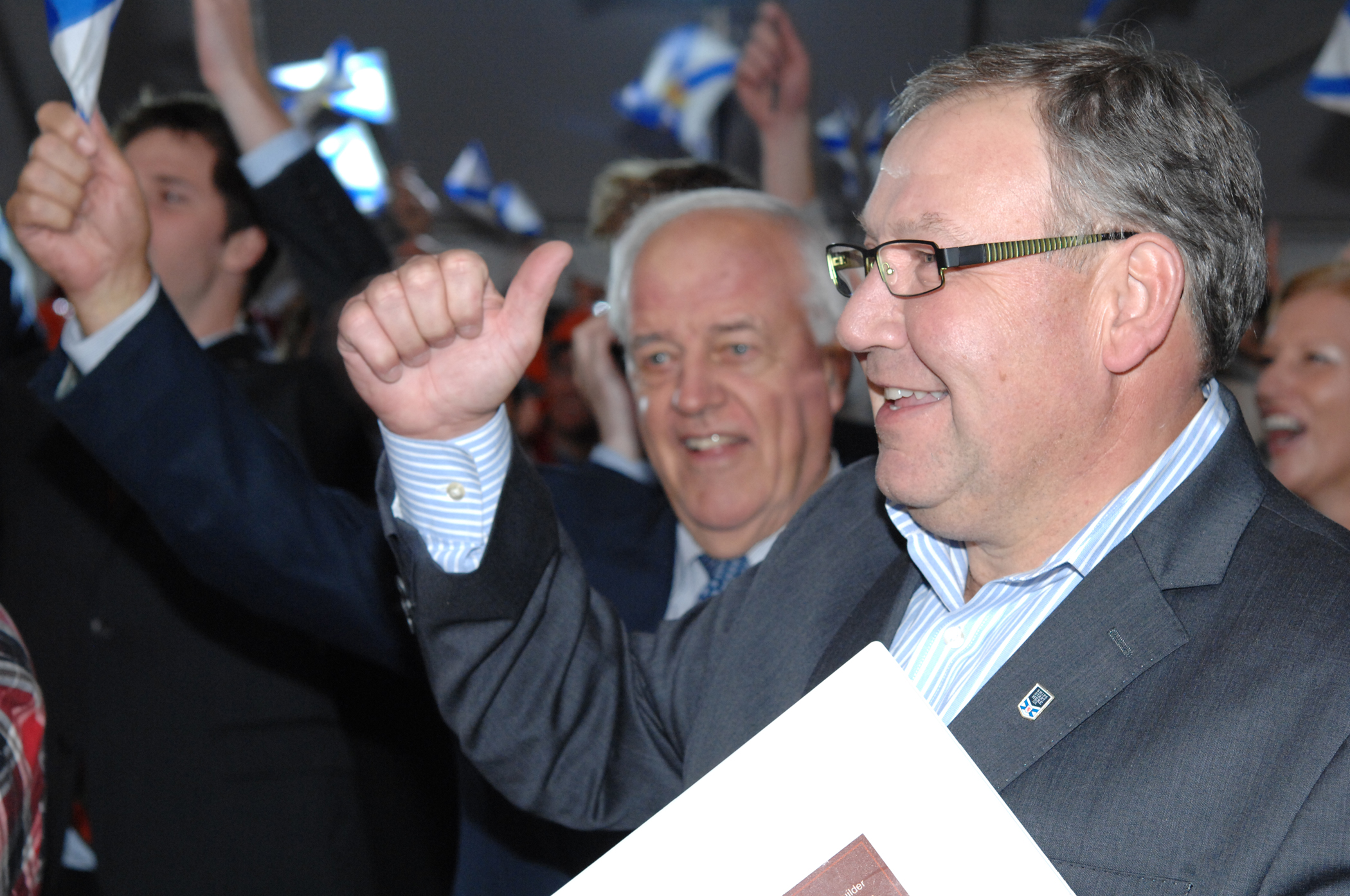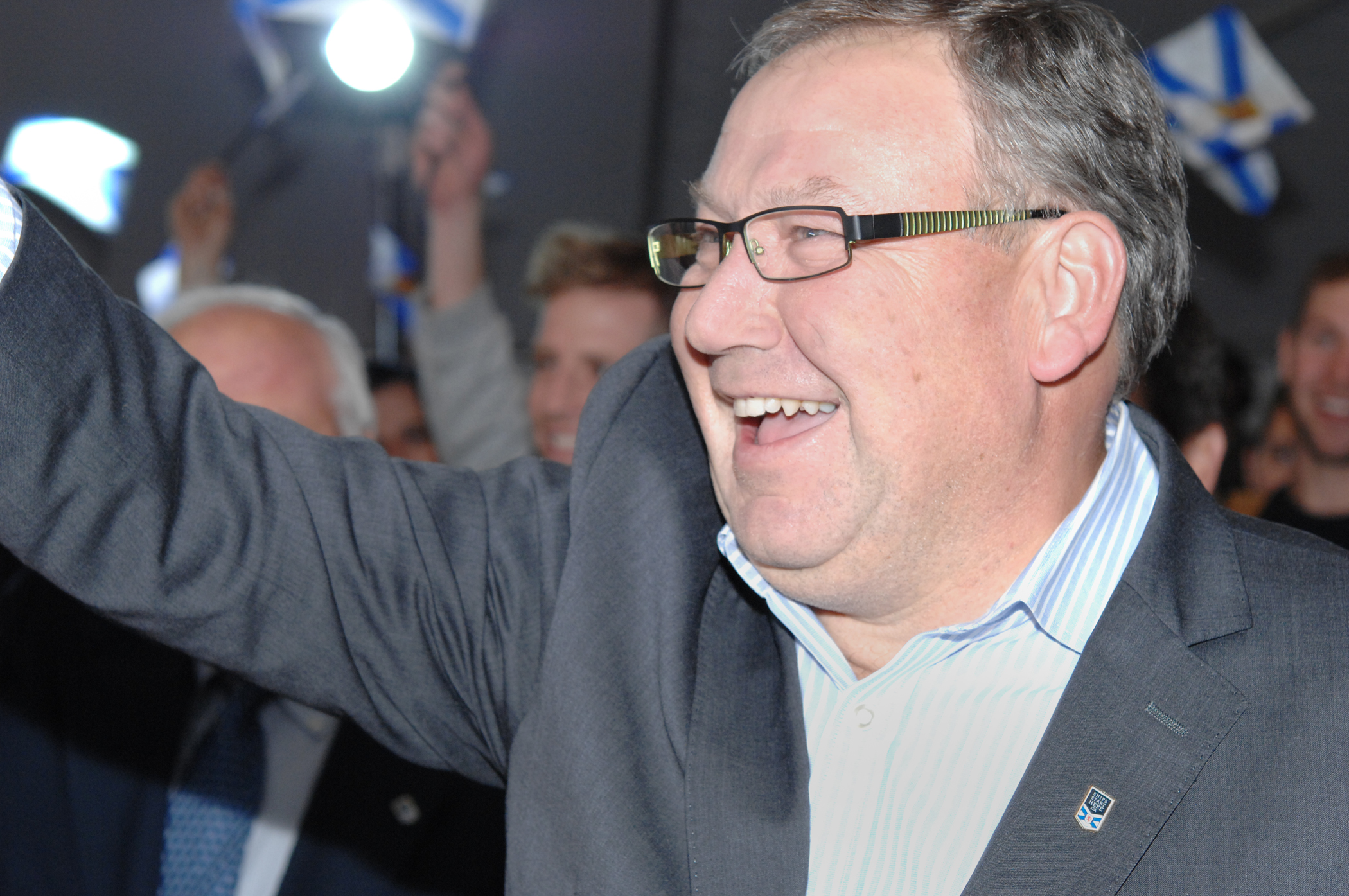 Premier Darrell Dexter gives a thumbs up after the announcement that Nova Scotia won the $25-billion contact to build combat ships as part of the National Shipbuilding Procurement Strategy.