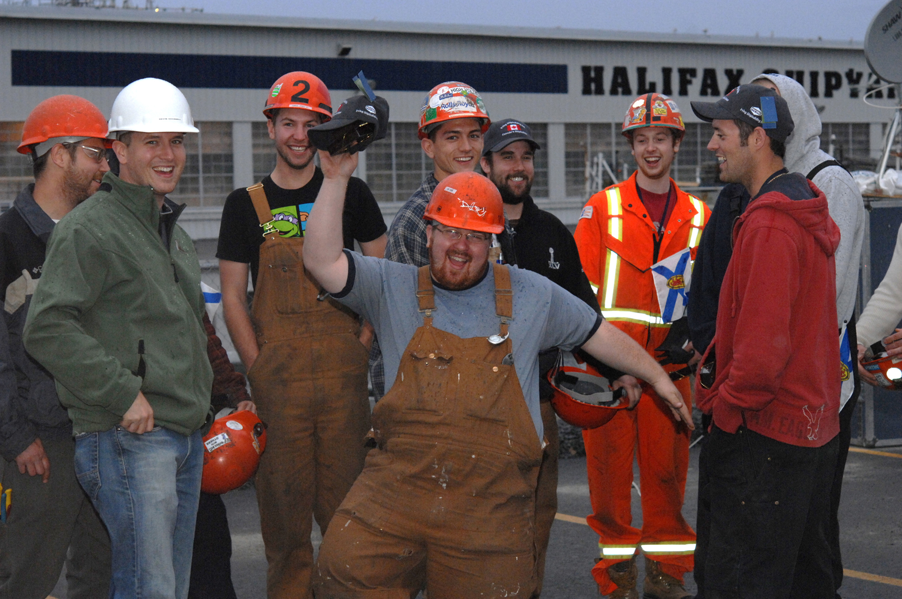 Irving Shipyard workers joke around after learning the company won the federal government's National Shipbuilding Procurement Strategy announcement, which awarded the Halifax shipyard a $25-billion contract.