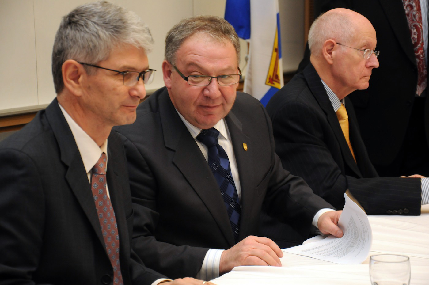 Premier Darrell Dexter, centre, with Rick Janega, president of Emera Newfoundland and Labrador (right) and John Harker, president, Cape Breton University.