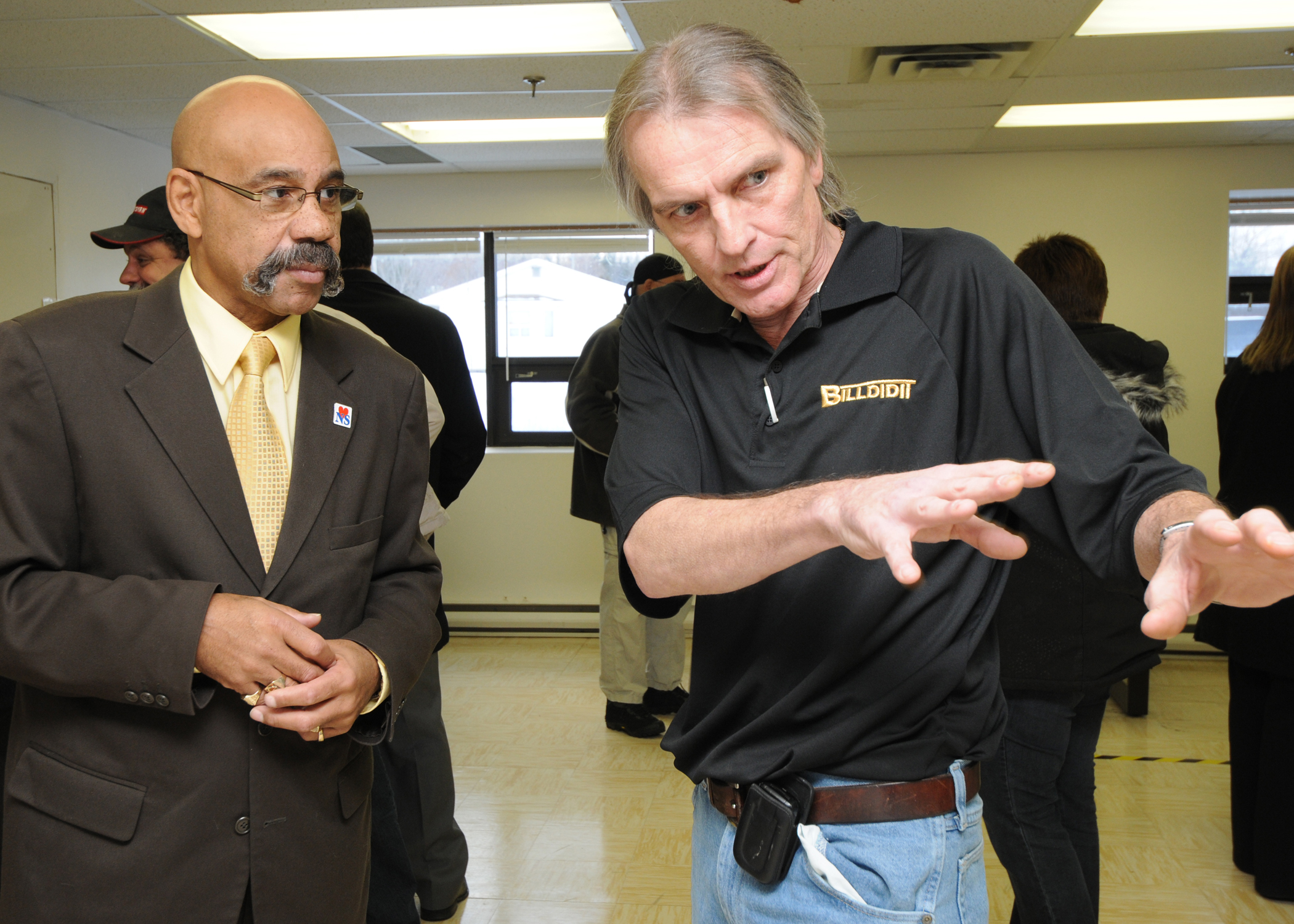 Billdidit's Bill Coady, inventor of the Coady clutch, talks with Economic and Rural Development and Tourism Minister Percy Paris.