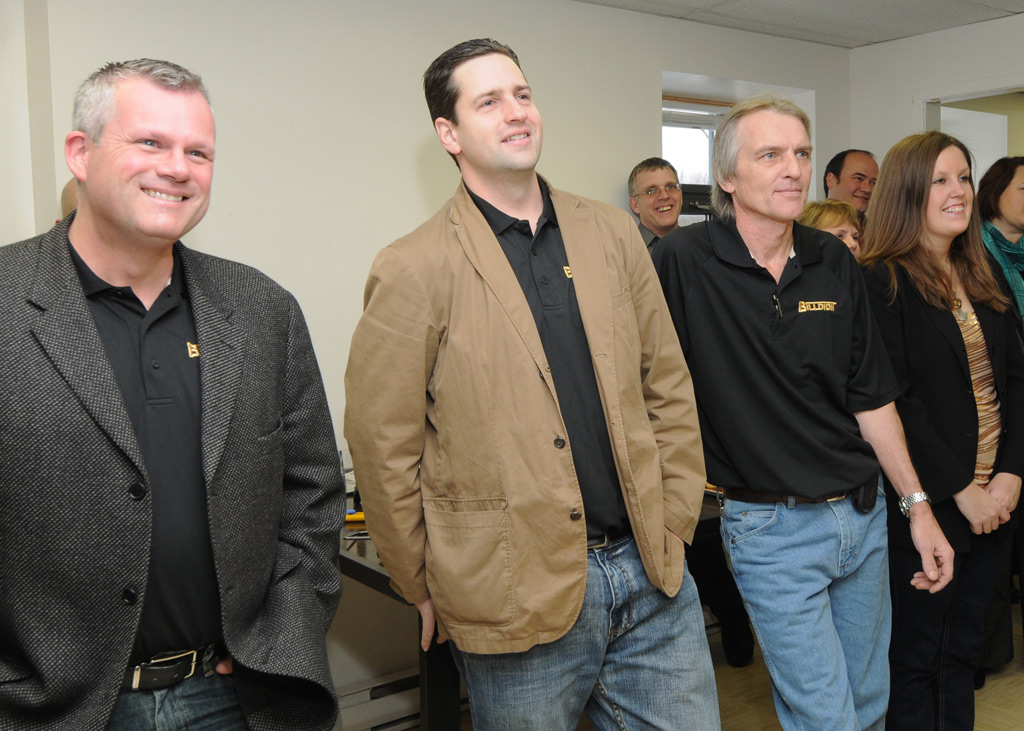 From left, Billdidit president Joe Menchefski, mechanical designer Matt Swan, inventor Bill Coady and Ashley MacDonald, with marketing, listen to Economic and Rural Development and Tourism Minister Percy Paris.