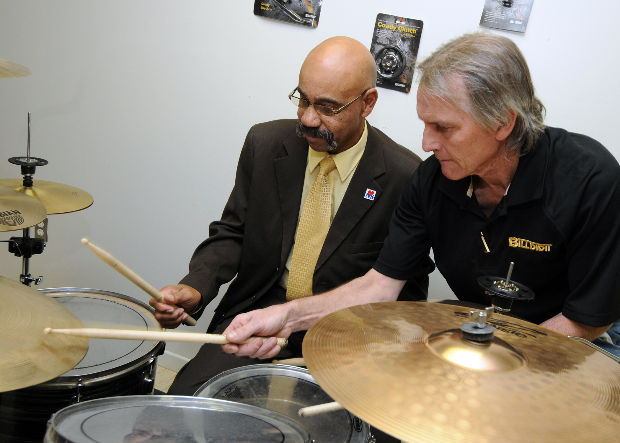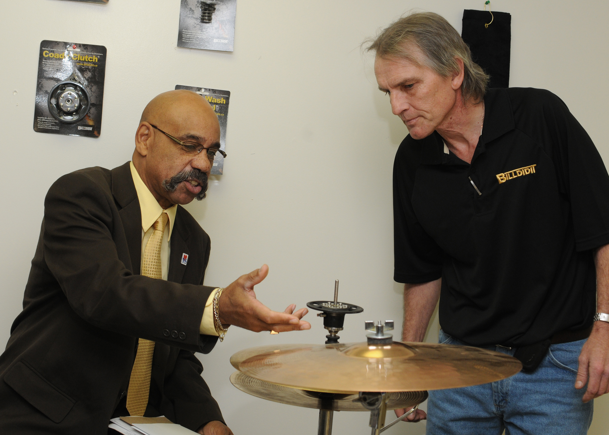 Economic and Rural Development and Tourism Minister Percy Paris and Billdidit's Bill Coady, discuss how his invention, the Coady clutch, works with hi-hat cymbals.