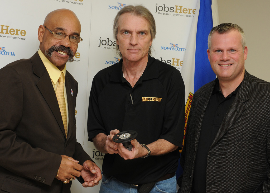 Economic and Rural Development and Tourism Minister Percy Paris stands with Billdidit's Bill Coady, holding his invention the Coady clutch and company president Joe Menchefski.