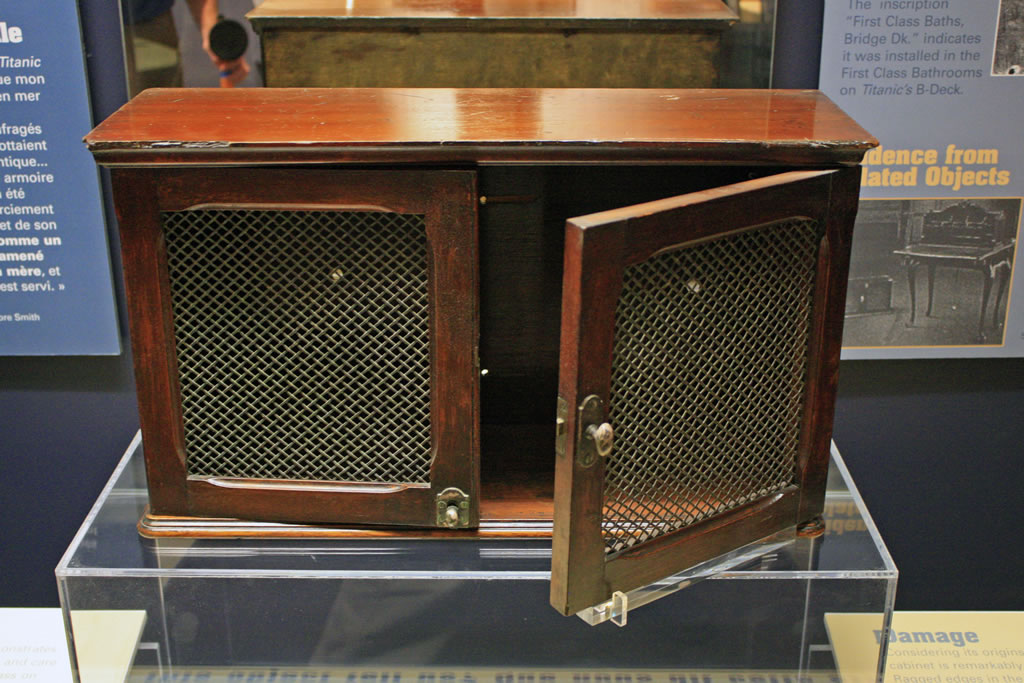 Preserved wooden cabinet from First Class bathroom aboard RMS Titanic. Carved by a carpenter from Belfast, Ireland. Credit: Gerry Lunn, Maritime Museum of the Atlantic