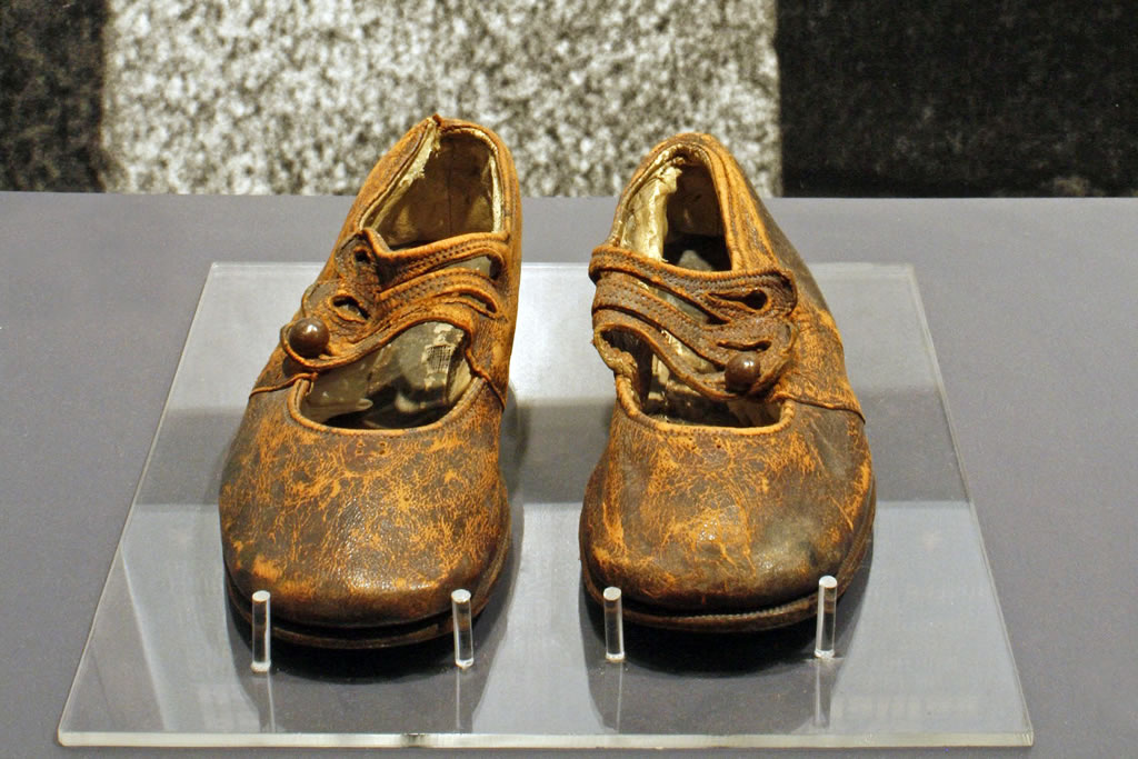 Shoes from a victim of the Titanic disaster or The Northover Titanic Shoes. This pair of leather children’s shoes is believed to be from Body No. 4, the “Unknown Child”. This very young boy, recovered by the crew of Mackay-Bennett, was buried at Fairview Lawn Cemetery in Halifax. Credit: Gerry Lunn, Maritime Museum of the Atlantic