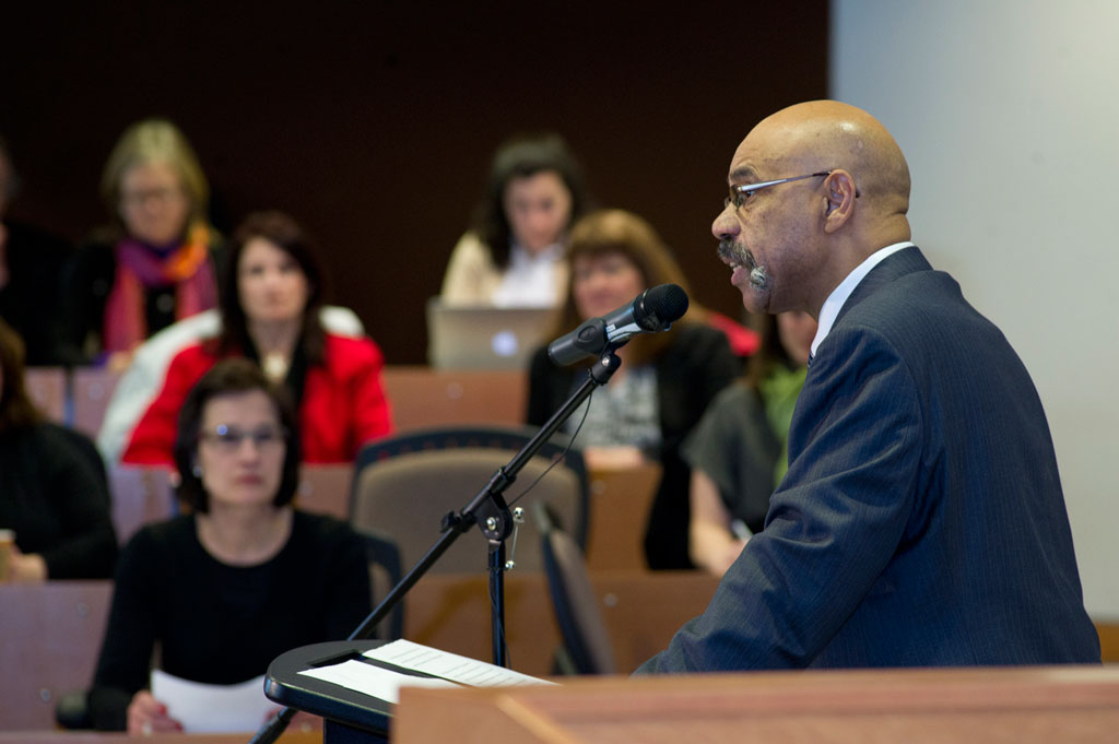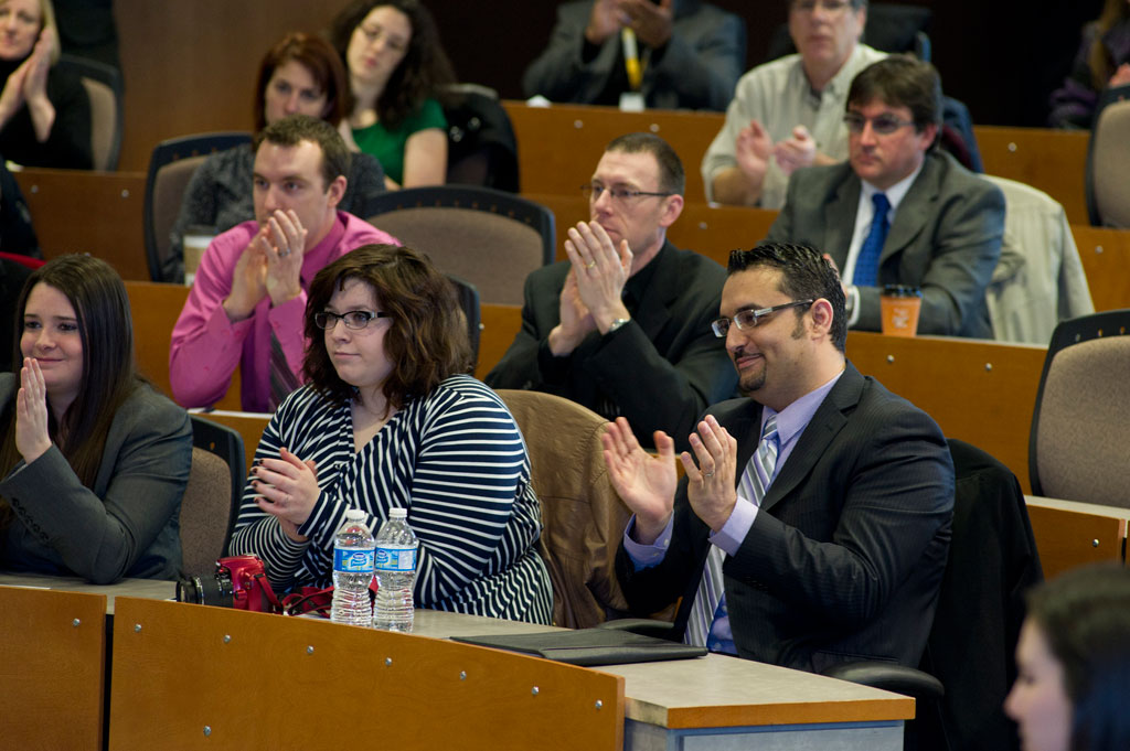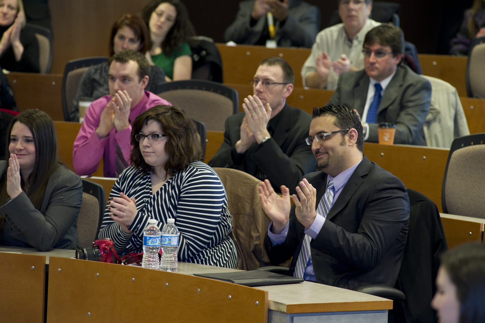 People in attendance applaud as Economic and Rural Development and Tourism Minister Percy Paris announces the province's new graduate placement program.