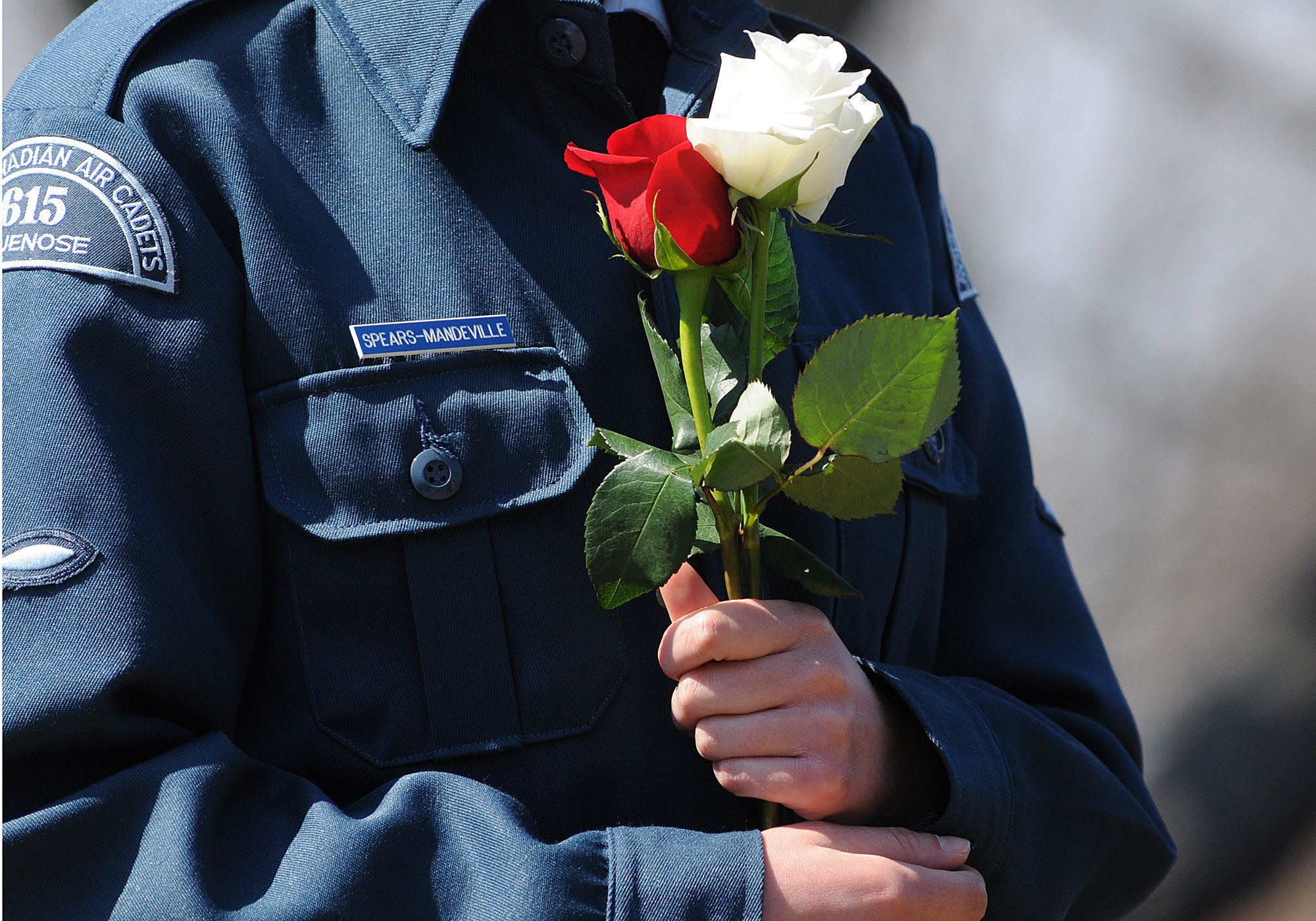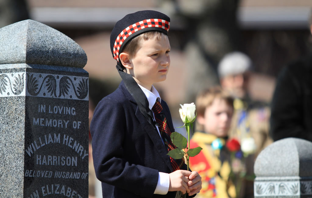 A young cadet places a rose on the headstone of one of the Titanic gravesites during the Titanic Spiritual Ceremony at the Fairview Lawn Cemetery.