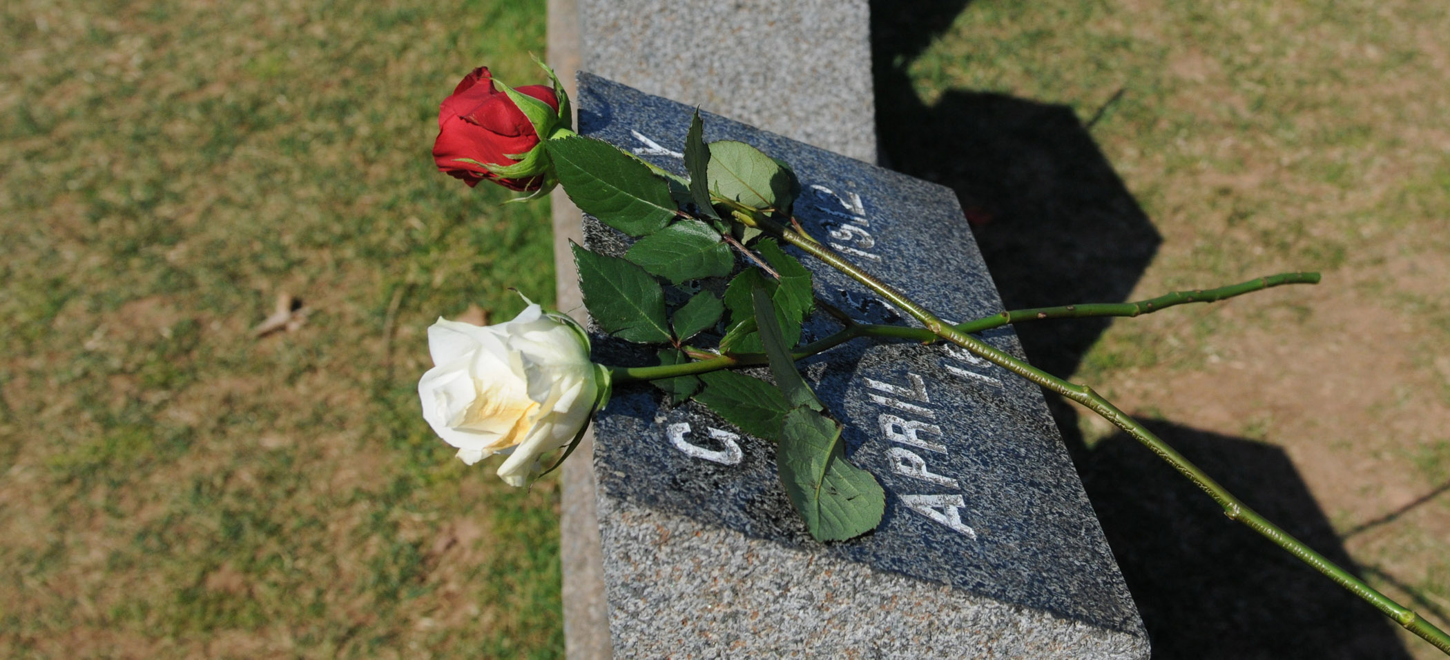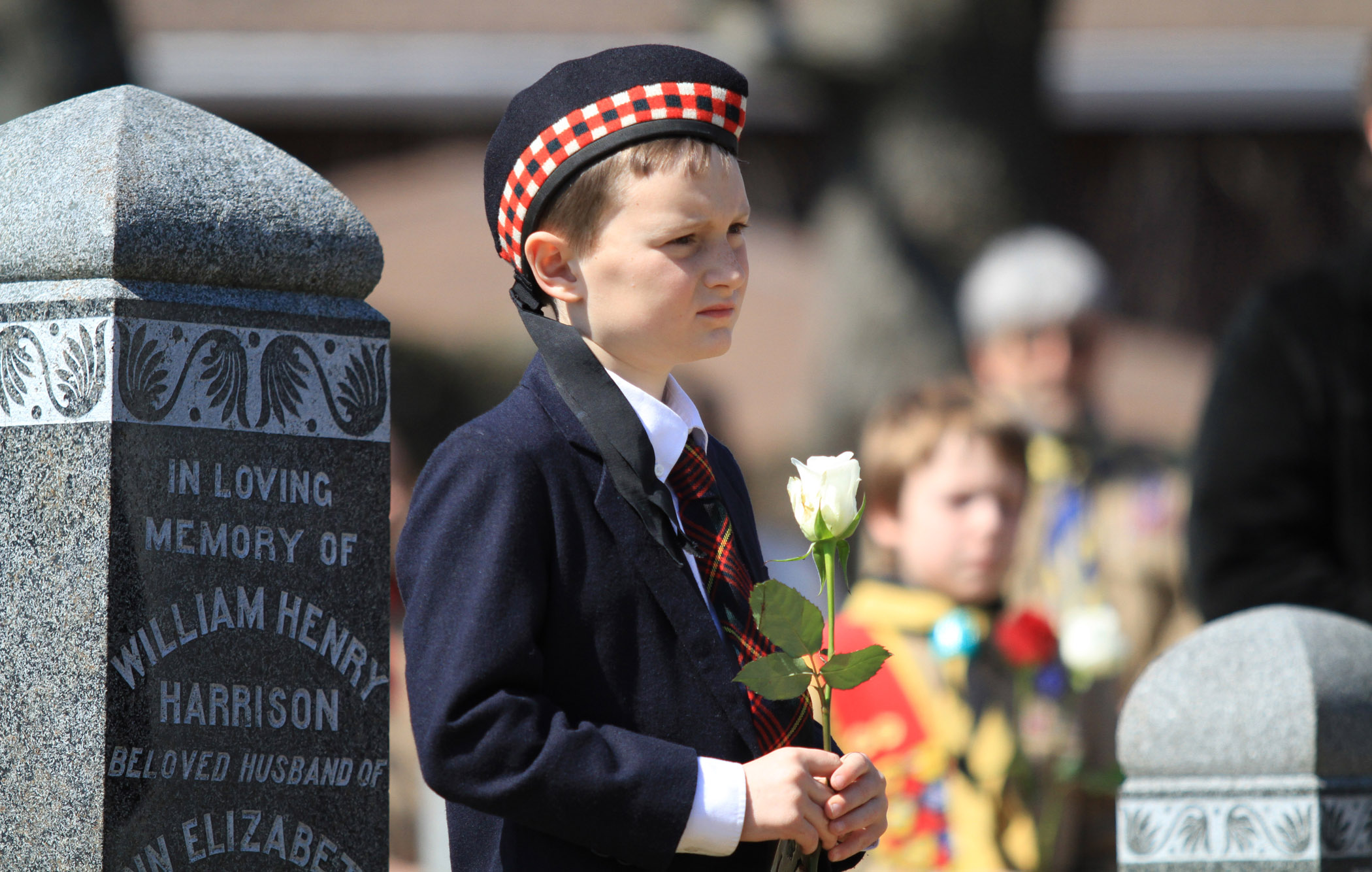 A boy prepares to place a rose at one of the Titanic gravesites during the Titanic Spiritual Ceremony at the Fairview Lawn Cemetery.