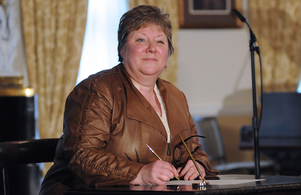 Finance Minister Maureen MacDonald, the former Minister of Health and Wellness, completes her paperwork.
