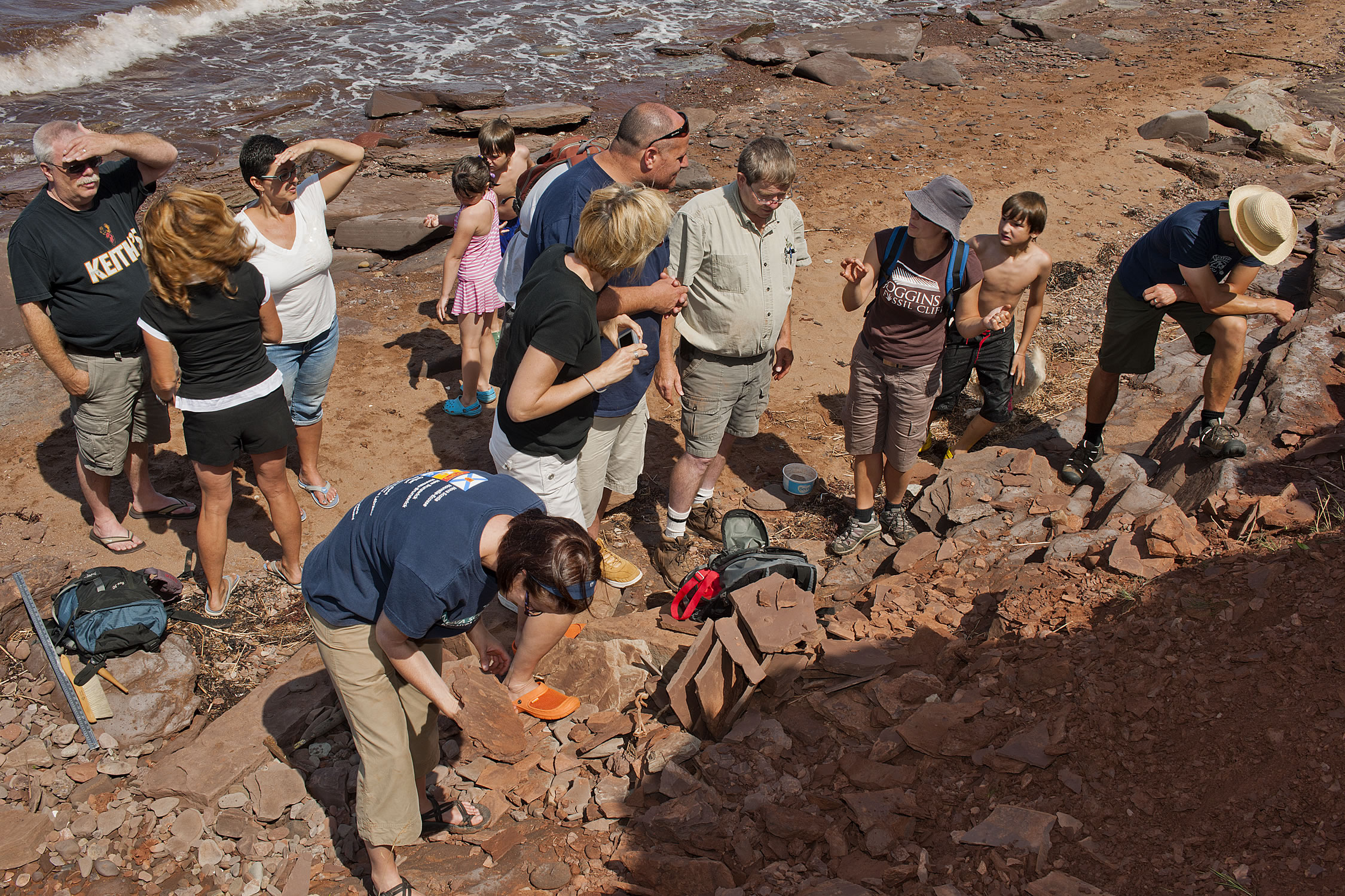 Palaeontologists from the Nova Scotia Museum, Fundy Geological Museum, and the Joggins Fossil Institute along with the members of the Keating families, who discovered the fossils, at the dig site.