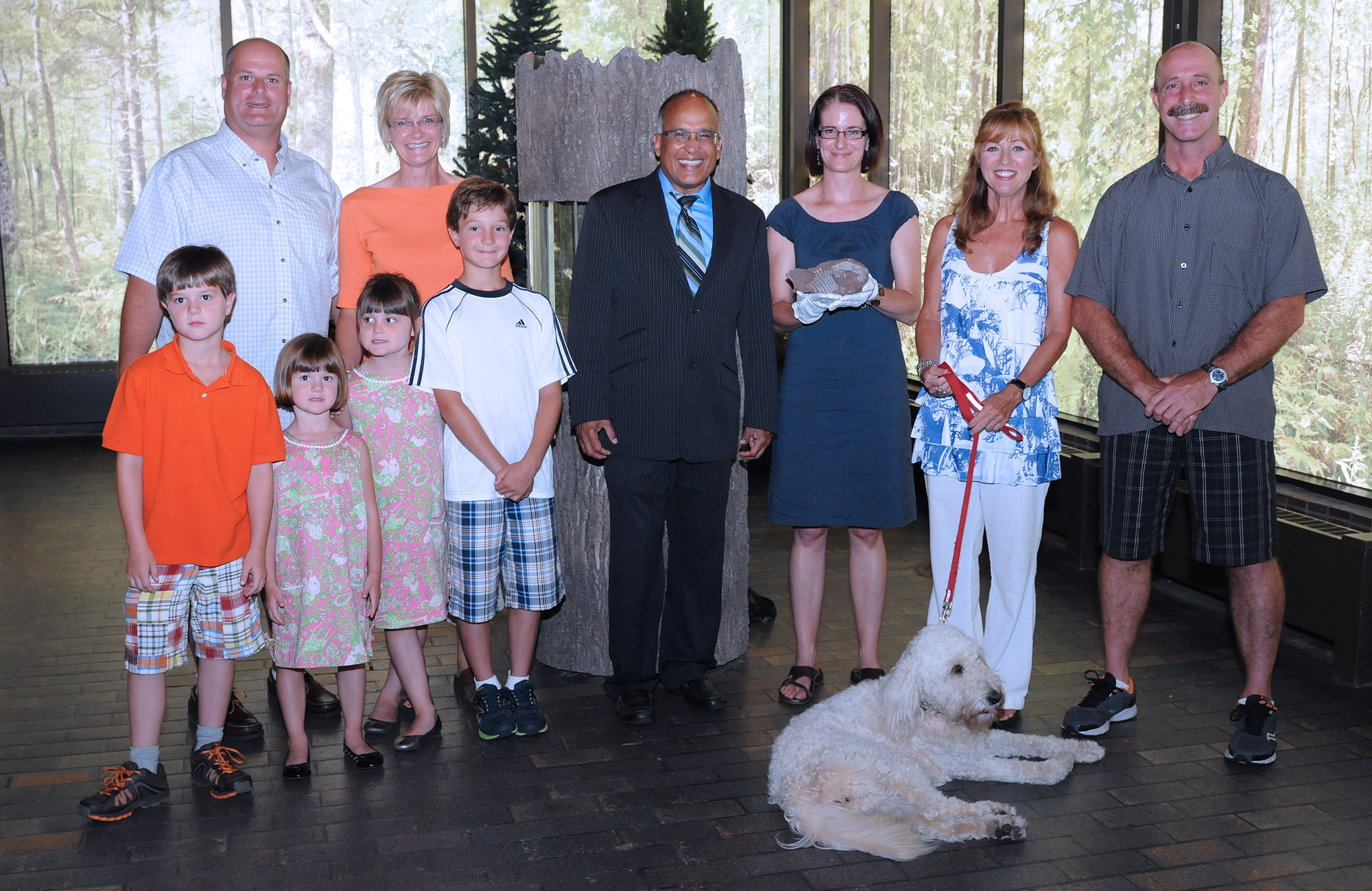 Leonard Preyra, Minister of Communities, Culture and Heritage, and Deborah Skilliter, curator of geology for the Nova Scotia Museum who is holding the Superstar fossil, stand with the Keating families, who found and brought the artifacts to the museum.