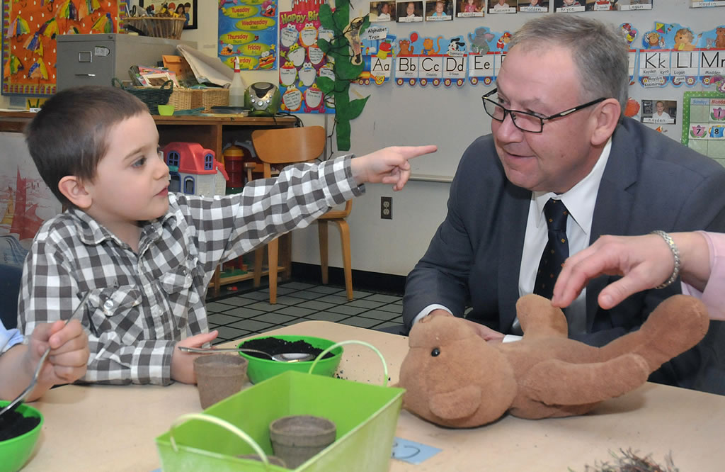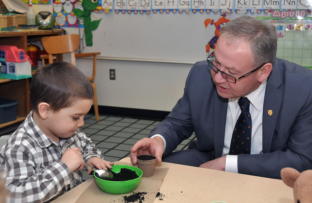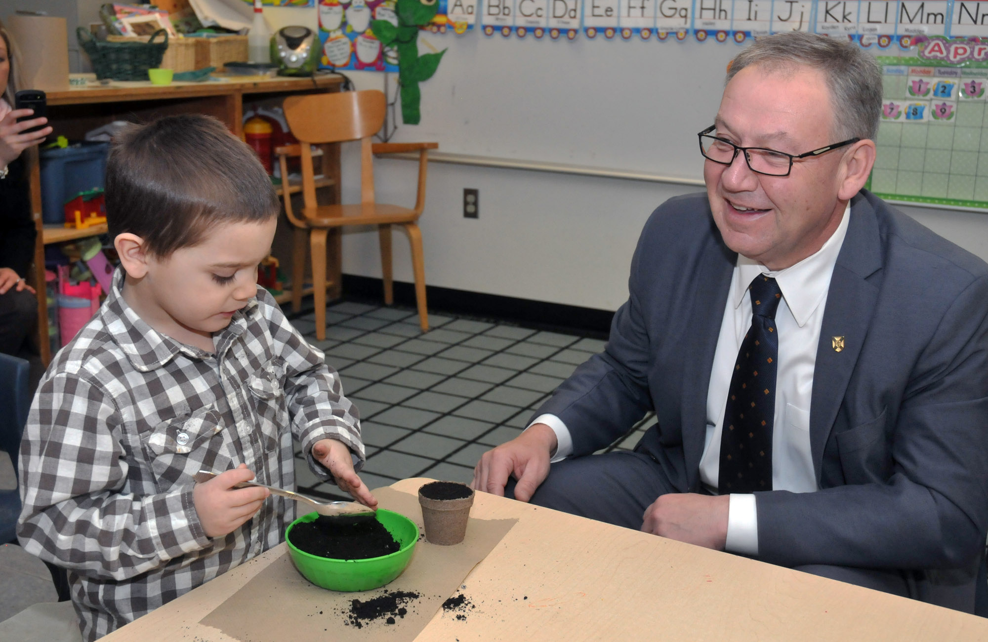 Premier Darrell Dexter helps Kayden Lethbridge with some potting soil during an Early Years announcement Rockingstone Heights School.