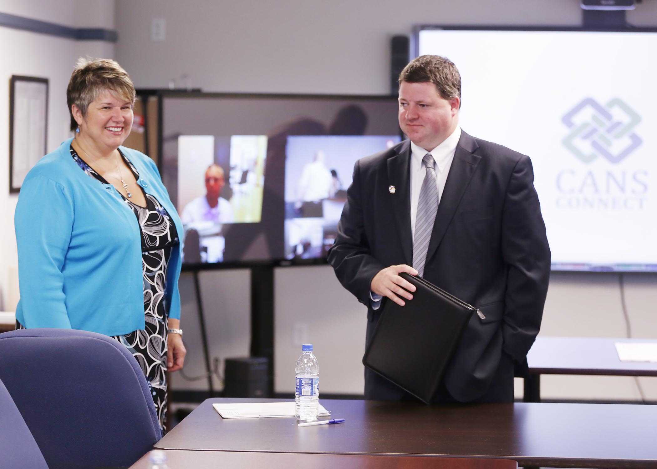 MLA Becky Kent, on behalf of Labour and Advanced Education Minister Frank Corbett, and Construction Association of Nova Scotia president Duncan Williams, discuss how the new video system will benefit more than 750 commercial construction businesses across the province.