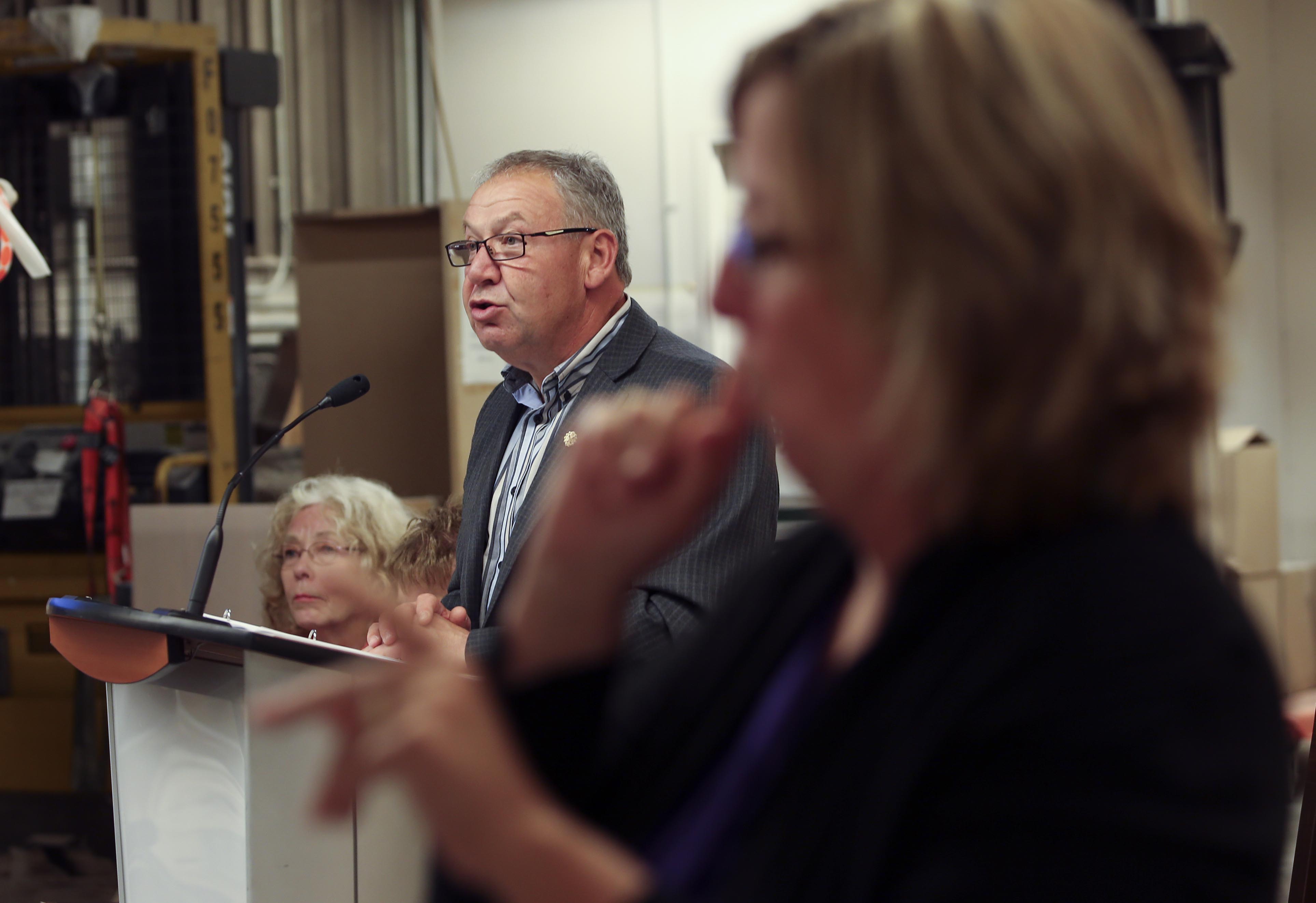 A sign language interpreter signs for audience members while Premier Darrell Dexter speaks.