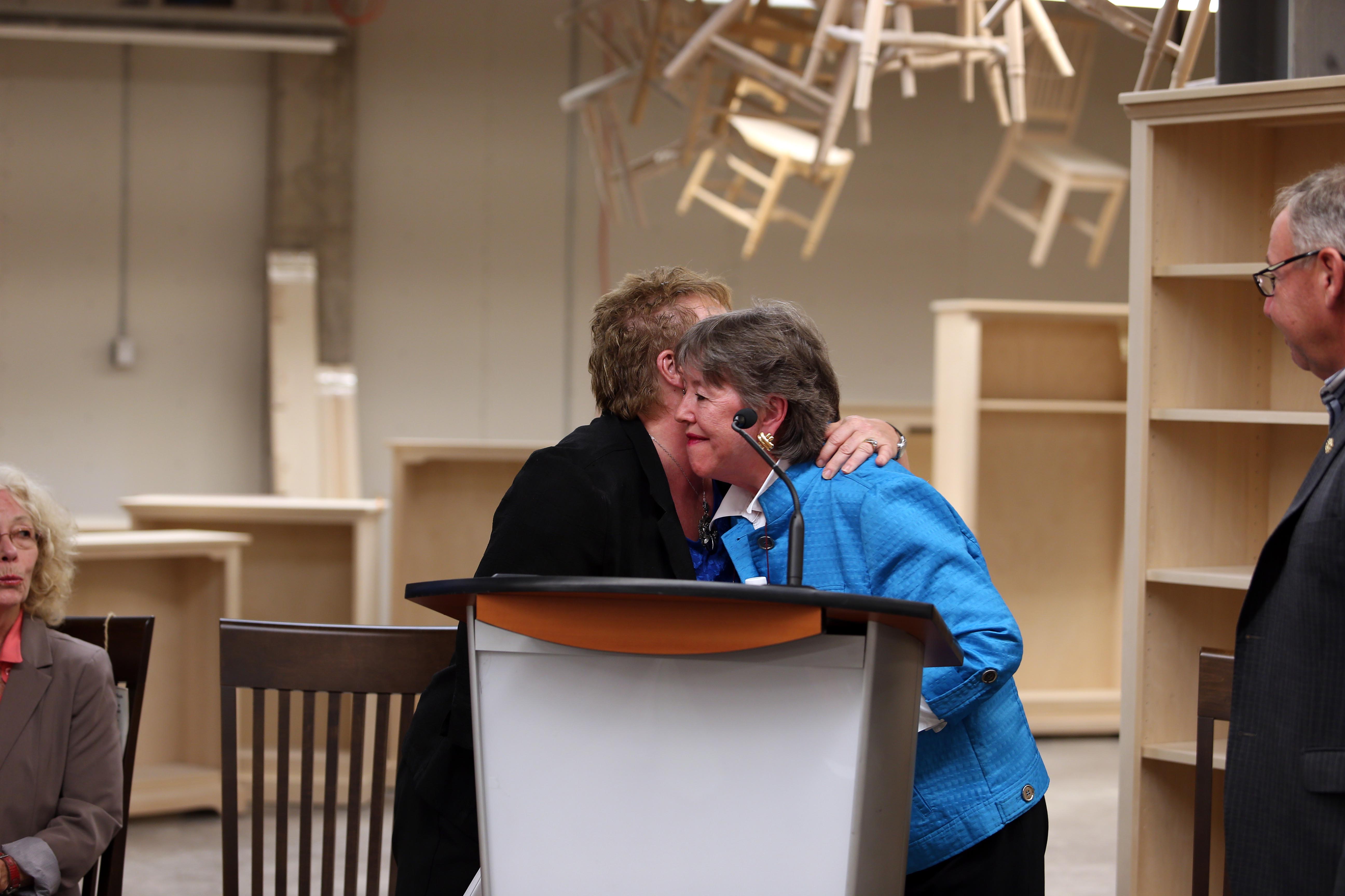 Community Services Minister Denise Peterson-Rafuse hugs Sheila Henman, whose 59-year-old sister Ellie Chisholm has Down syndrome and lives in an assisted living setting in Waverley.