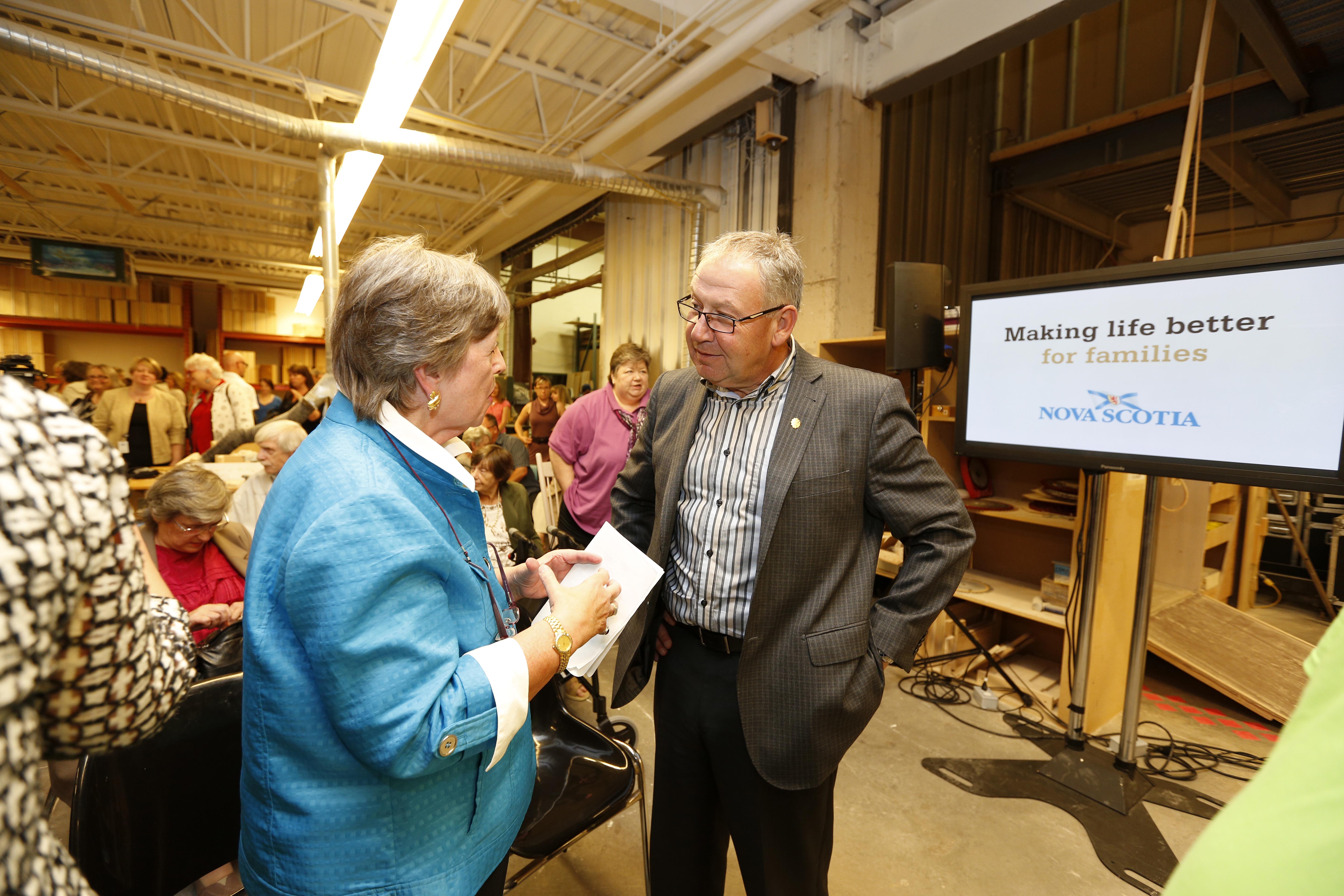 Premier Darrell Dexter speaks with Sheila Henman, whose 59-year-old sister Ellie Chisholm has Down syndrome and lives in an assisted living setting in Waverley.