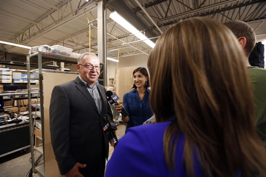 Premier Darrell Dexter chats with staff at Lake City Woodworkers, where many staff with special needs are employed.