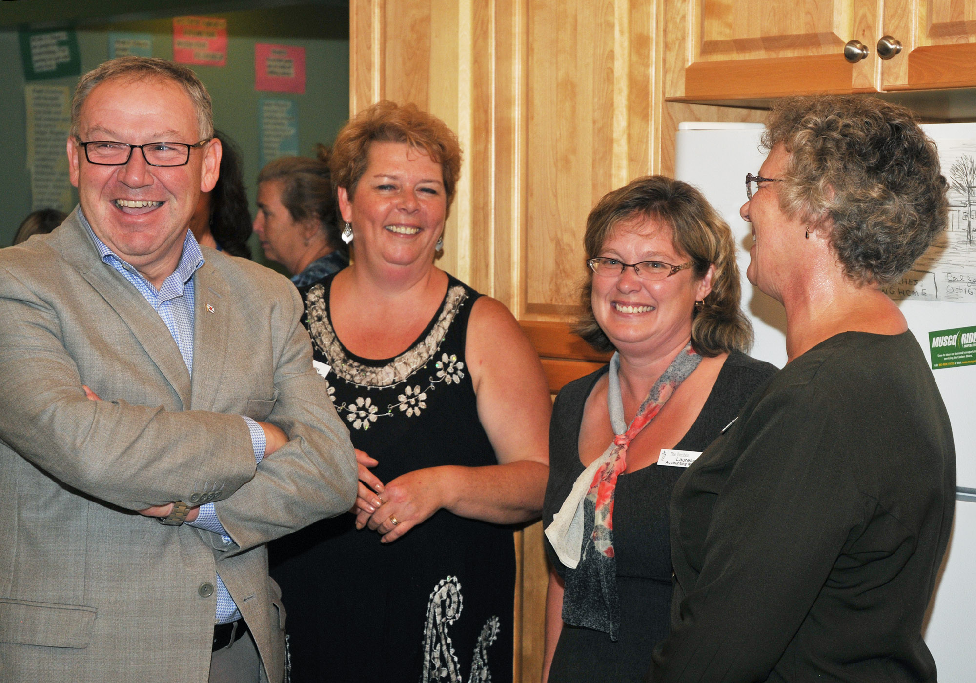 From left, Premier Darrell Dexter chats with Clasina MacKinnon, Laurena Turple and Audrey Engbersen, staff at The Birches.